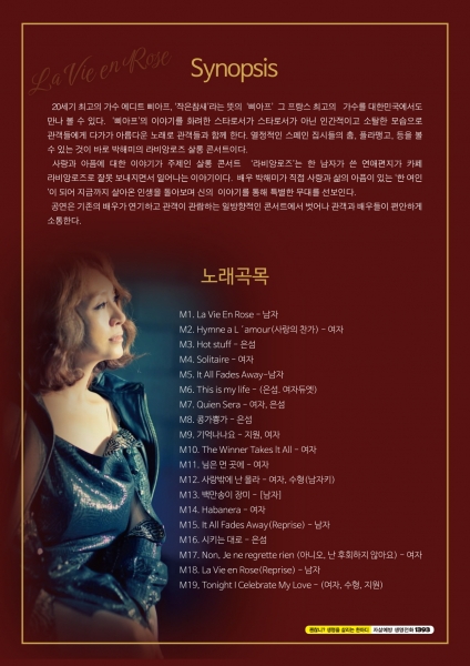 ‘박해미의 살롱콘서트 라비앙로즈’는 한 남자가 쓴 연애편지가 카페 라비앙로즈로 잘못 보내지면서 일어나는 이야기로 배우 박해미가 직접 사랑과 삶의 아픔이 있는 ‘한여인’이 돼 지금까지 살아온 인생을 돌아보는 특별한 내용의 공연을 선보인다.