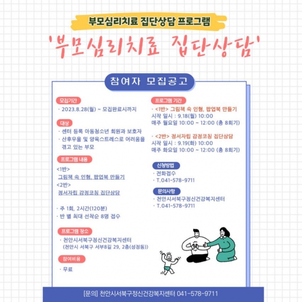 프로그램은 서북구 정신건강복지센터에서 진행되며 참여대상자는 서북구정신건강복지센터 등록회원 보호자, 천안시 서북구 거주하는 양육자이거나 출산 전·후 여성으로 선착순 모집한다.
