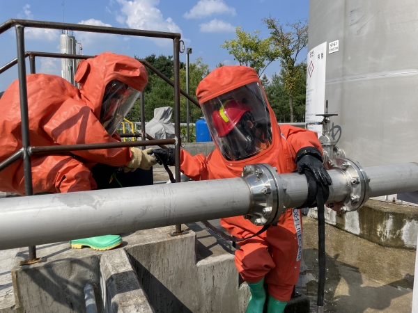이날 훈련은 운반·제조·저장시설별 유해화학물질 누출사고를 차단하기 위해 사고방지 안전교육 유해물질 차단 장비를 활용한 시설·유형별 누출 차단 훈련 훈련 강평 및 피드백 순으로 진행됐다.