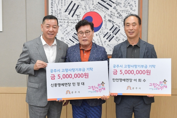 [Ytv영상스토리] 공주시는 지난 11일 이희수 명예탄천면장, 정근철 명예사곡면장, 민경대 명예신풍면장이 고향사랑기부금을 기탁했다고 밝혔다.