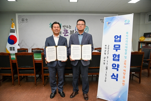 협약식에는 박정현 부여군수와 박병욱 한전MCS부여지점장 등이 참석해 복지사각지대 및 고독사 등 위기 징후 포착 가구에 대한 발굴업무에 협력하기로 했다.