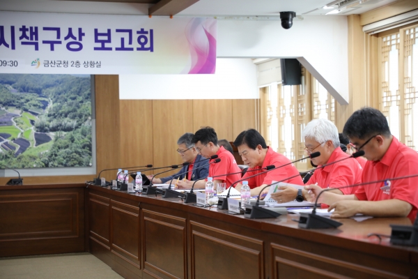 한편 민선8기 금산군정은 5대 군정전략으로 찾아오는 매력도시 중흥하는 경제도시 건강힐링 행복도시 세계속의 인삼수도 신뢰받는 희망군정 등을 설정하고 이를 실현하기 위한 인구·관광·경제·활기·행복·교육·세계화·농업·문화체육·신뢰소통 등 10대 군정과제를 해결에 나서고 있다.