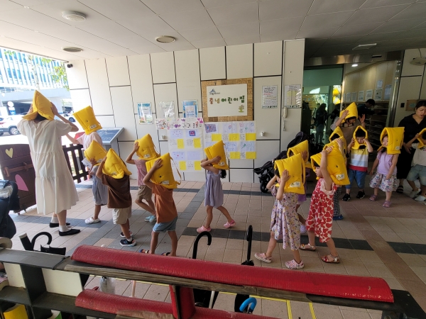 이날 대피 훈련에 앞서서는 안전 분야 전문 강사가 지진대피 행동 요령과 지진 방재 모자 사용법 등을 어린이 눈높이에 맞춰 교육했다.