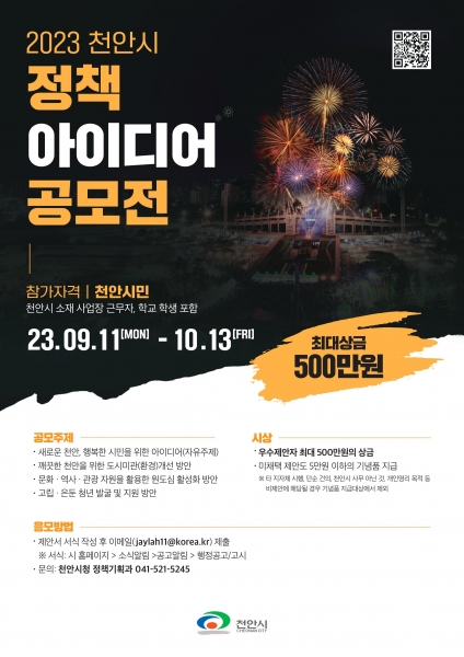 정책 아이디어는 이메일 방문, 우편 등으로 제출 가능하며 자세한 사항은 천안시 누리집 행정공고·고시란을 참고하면 된다.