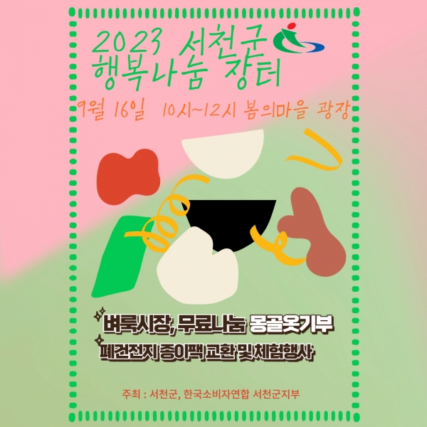 서천군과 한국소비자연합 서천군지부가 주관하는 이번 행사는 중고 생활용품 및 옷 나눔 행사 폐건전지 및 종이팩을 새 제품으로 바꿔주는 교환행사 폐자원을 활용한 업사이클링 체험행사 등이 운영될 예정이다.