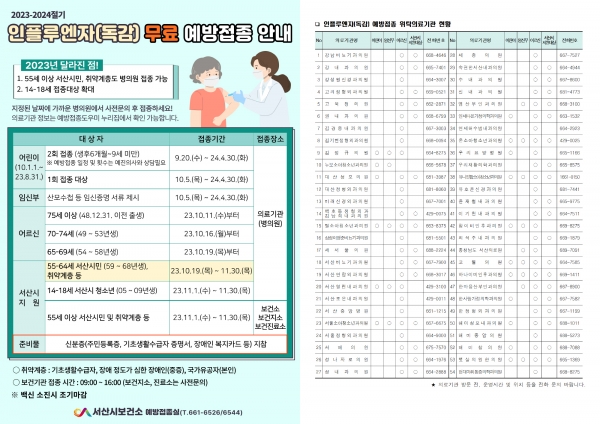 어린이와 임신부 접종은 10월 5일 어르신은 10월 11일부터 순차적으로 실시되며 주소지에 상관없이 접종할 수 있다.