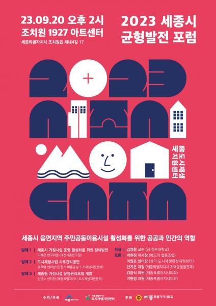 세종특별자치시는 오는 20일 오후 2시 조치원 1927 아트센터 다목적홀에서 읍면지역 주민공동이용시설 활성화를 위한 공공과 민간의 역할을 주제로 ‘2023 세종시 균형발전 포럼’을 개최한다.