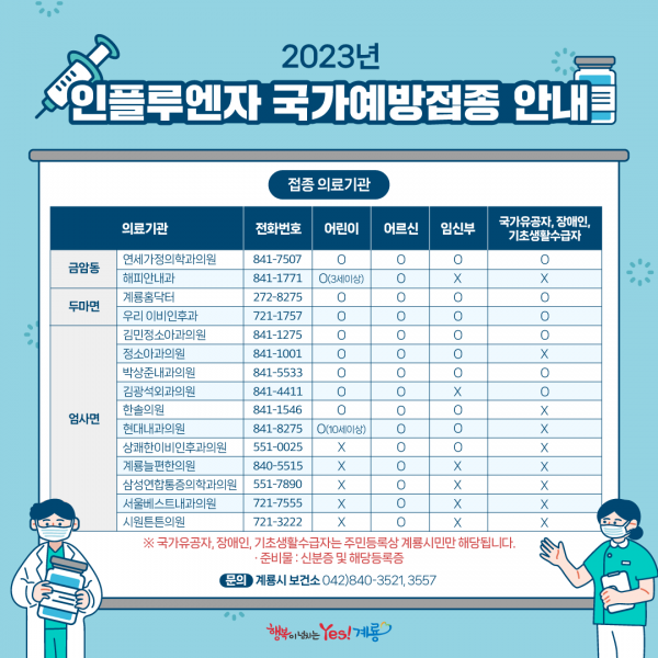 [Ytv영상스토리] 계룡시 보건소는 20일부터 내년 4월 30일까지 보건소와 관내 민간의료기관 16개소에서 인플루엔자 국가예방접종을 실시한다고 밝혔다.