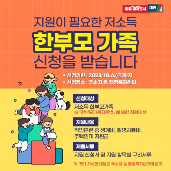 지원 요건을 충족하는 저소득 한부모가정은 오는 10월 6일까지 거주지 관할 행정복지센터로 방문해 신청할 수 있다.