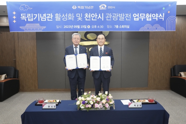 이날 협약식은 ‘2023 천안 K-컬처 박람회’를 계기로 새롭게 조명되는 독립기념관을 활성화하고 그 일대를 천안 관광의 핵심 거점 공간으로 조성하기 위한 상호 협력과 지원을 뒷받침하기 위해 개최됐다.