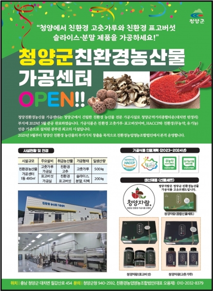 가공센터는 친환경 농산물 재배 농가의 부가가치 증대와 소득향상을 위한 전문 가공시설로 해썹과 친환경 인증기준을 충족하는 시설로 친환경 고춧가루 가공실, 표고버섯 가공실을 갖췄다.