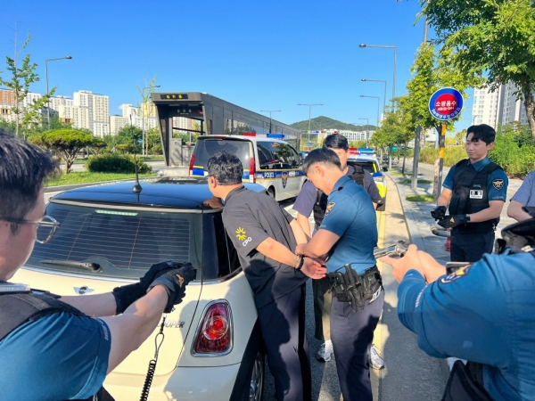 이날 훈련은 지역경찰과 112치안종합상황실, 형사팀, 교통 순찰차가 다중밀집 지역인 버스터미널에서 불특정 다수인에게 흉기를 휘둘러 사상케 한 후 도주하는 정신이상자를 검거하고 피해자에 대한 보호조치를 실시하는 방식으로 진행됐다.