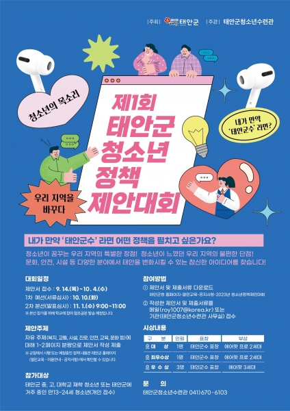 태안군, ‘제1회 청소년 정책제안대회’ 개최, 10월 4일까지 접수