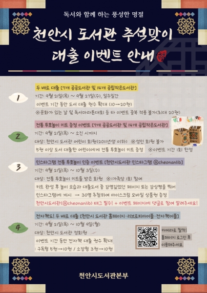 [Ytv영상스토리] 천안시도서관본부는 추석을 맞아 시민들이 독서와 함께 풍성한 연휴를 보낼 수 있도록 다양한 대출 이벤트를 운영한다고 21일 밝혔다 이번 행사는 천안시 8개 공공도서관과 14개 공립작은도서관 도서 대출자를 대상으로 하며 대출 권수를 최대 20권까지 늘려주는‘두배로 대출’을 비롯해 어린이 대출자를 위한‘전통투호놀이 키트 증정’, ‘전자책 대출 권수 확대’ 등 다채로운 행사로 운영된다.