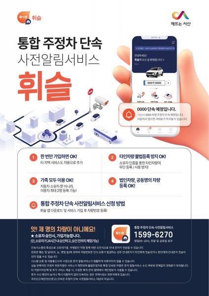 이번에 제공되는 주정차 단속 알림 통합서비스는 서산시를 포함한 서비스에 가입된 약 70개 지자체의 불법 주정차 알림 서비스를 제공하며 한 차량에 최대 3명이 서비스를 받을 수 있다.