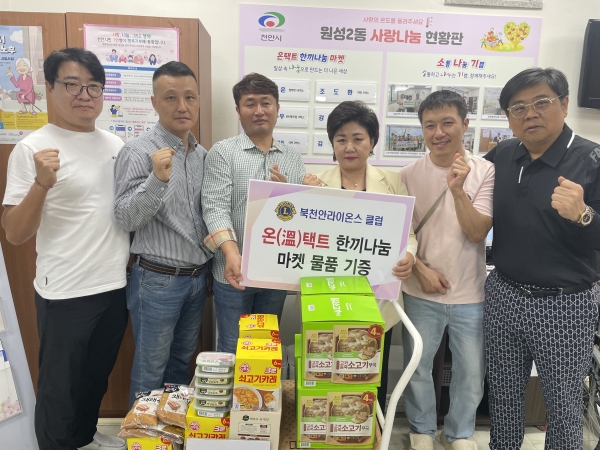 이날 북천안라이온스클럽은 원성2동의 경제적으로 힘든 취약계층의 식품 구입에 어려움을 해소하기 위한 온택트 한끼 나눔 마켓에 식료품 등을 전달했다.