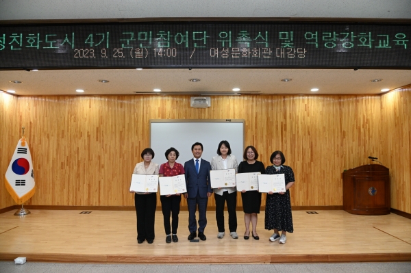 이번 위촉된 여성친화도시 4기 군민참여단은 지난 9월 1일부터 15일까지 공개모집을 통해 선발된 군민 20명으로 구성됐으며 교육, 안전·홍보등 2개 분과로 나눠 활동하게 된다.