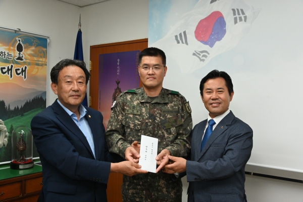 이날 격려방문은 군민의 생명과 재산을 보호하기 위해 국방의 의무를 수행하고 있는 현역 및 예비역 장병의 노고를 격려하기 위해 이뤄졌으며 기관별로 격려금을 전달했다.