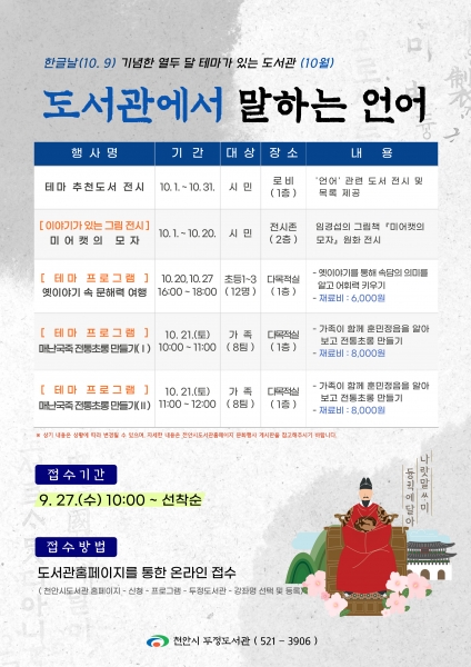 천안시 두정도서관, 10월 테마 ‘언어’ 행사 운영