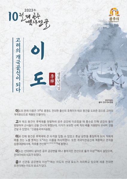 조병철 문화재과장은 “공주 금강을 터전으로 해 고려의 개국공신이 되었던 이도의 업적을 기리기 위해 10월의 역사인물로 선정했다”며 “10월 중 시민을 대상으로 관련 행사를 개최할 예정”이라고 말했다.