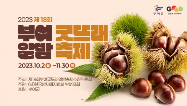 한국밤재배자협회 부여지회 이봉배 회장은 “본 축제에서 칼집밤으로 이미 널리 알려진 뜨래밤과 대보를 만나 볼 수 있다”며 “굿뜨래몰에서 뜨래밤 및 일반밤을 쿠폰가로 구입이 가능하다”고 전했다.