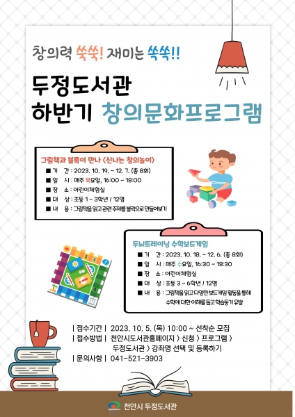 두정도서관 관계자는 “어린이 특화 두정도서관에서 독서·놀이·체험을 융합한 창의문화 프로그램으로 아이들이 책과 친숙해지는 계기가 되고 나아가서 도서관을 창의력과 즐거움이 넘치는 공간으로 인식했으면 한다”고 말했다.