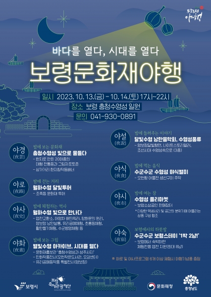 이 밖에도 야설 ‘달빛수영 낭만음악회, 수영성 풍류’ 야시 ‘수영성 플리마켓’ 야식 ‘수군수군 수영성 야식별미’ 야숙 ‘수군수군 보령스테이 1박 2냥' 등 다채로운 프로그램을 운영한다.