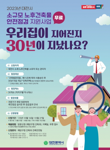 지원대상은 건축물관리법 제15조에 따라 사용승인 후 30년 이상 지난 단독주택으로 10월 27일까지 모집하며 선정이 되면 전문가가 직접 현장을 방문해 무료로 점검을 해준다.