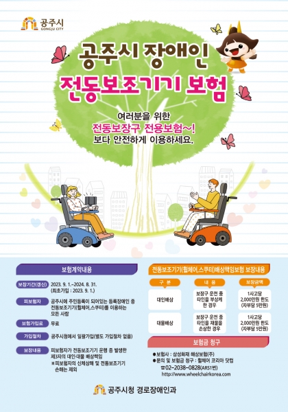 보장 기간은 2023년 9월 1일부터 2024년 8월 31일까지이며 공주시에 주민등록을 둔 전동보장구 이용 등록장애인이면 별도 가입 절차 없이 자동으로 가입된다.
