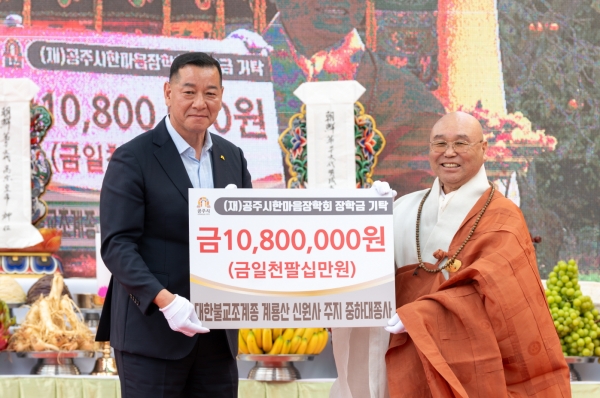 대한불교조계종 신원사(주지 중하대종사)에서 지역인재 육성과 생활 형편이 어려운 학생들을 위해 써달라며 장학금 1080만원을 전달했다(사진=공주시)