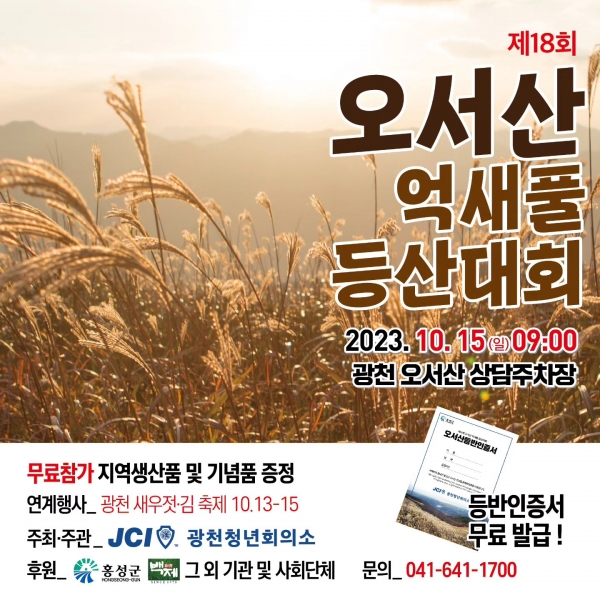 광천청년회의소의 주최·주관으로 열리는 이번 등산대회는 13일부터 개막하는 광천김·토굴새우젓 대축제와 연계해 개최되어 가을바람에 물결치는 억새풀의 아름다움과 K푸드 대표주자 광천김과 광천토굴새우젓을 함께 즐길 수 있다.