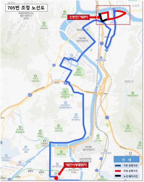 705번은 신탄진기점에서 대전시청종점까지 운행되는데 그동안 시내버스 서비스가 제공되지 않았던 금강로하스엘크루, 금강센트럴파크 서희스타힐스 및 동일스위트리버스카이 아파트를 경유하게 된다.
