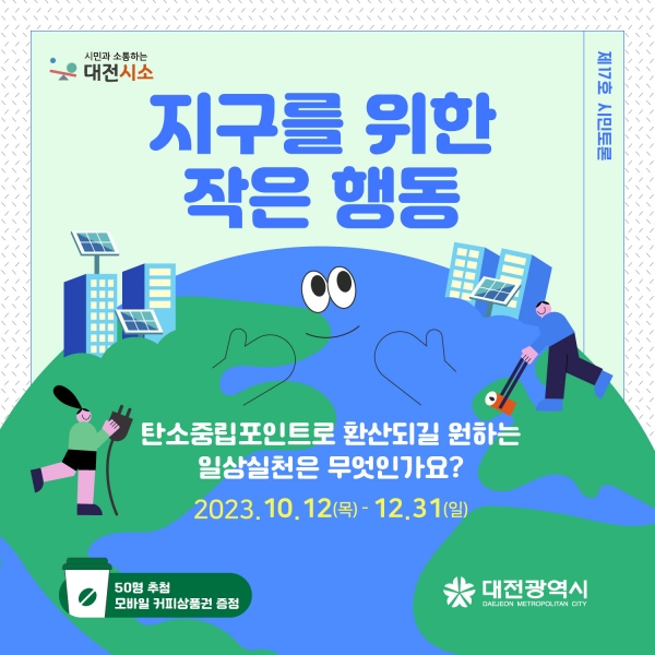 2030년까지 탄소배출량 ‘30% 감축’과 2050년까지 순배출량 ‘0 달성’을 목표로 시민들의 다양한 탄소중립 실현 아이디어를 받고 대전시 반려동물을 양육하는 가구가 17만 세대를 넘어서면서 일상에서 빈번하게 발생하는 반려인-비반려인 간 갈등, 반려동물로 인한 여러 가지 문제점 등에 대해서도 논의할 계획이다.