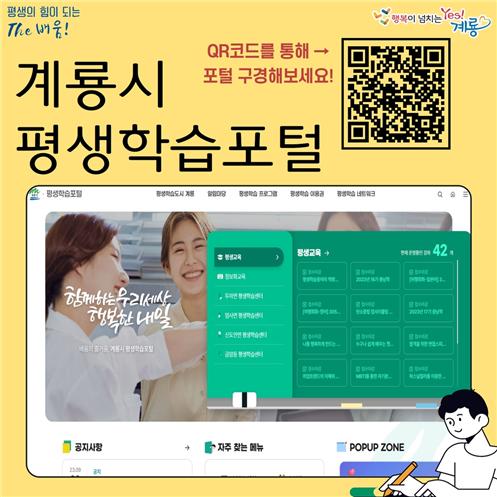 평생학습포털은 평생학습도시 계룡 알림마당 평생학습 프로그램 평생학습이용권 평생학습 네트워크 등 총 5개의 메뉴로 구성되어 있으며 그간 곳곳에 분산되어 있던 교육 정보를 한데 모아 시민의 평생학습 접근성을 높이는 데 중점을 뒀다.