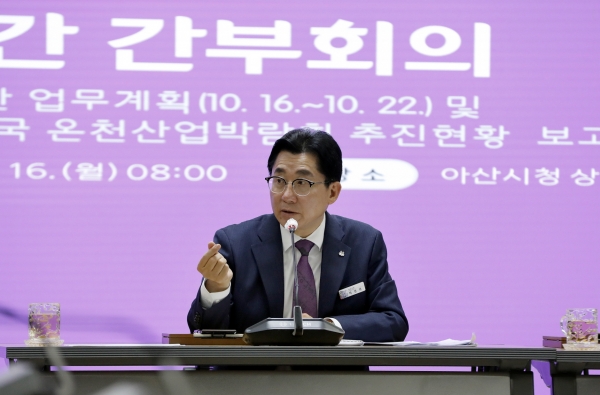 박경귀 시장은 16일 시청 상황실에서 열린 주간 간부회의에서 주간업무계획 및 온천산업박람회 추진 상황을 보고 받은 뒤 “이번 박람회는 실내뿐 아니라 시민로 150m 구간에서 거리 행사가 진행되기 때문에, 상인들과 시민들의 협조가 필수다.