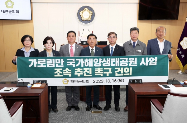 태안군의회는 가로림만 국가해양생태공원 조성사업의 조속 추진과 관광 자원화를 통한 지역발전 방안 모색, 가로림만 갯벌이 지닌 무한한 가치 경제성 적극 반영 요구, 예비타당성재조사를 신속히 통과시키고 경제성 평가의 어려움으로 통과가 어렵다면, 예타 면제를 통해 국책사업으로 신속하게 추진할 것을 건의했다.