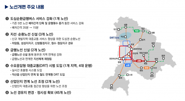 이번 개편안은 현재 운영 중인 버스노선 전체에 대한 빅데이터 분석, 운수사 협의, 시민들의 요구사항 등을 반영해 도심순환 급행버스 서비스 강화 지선·순환노선 신설 급행노선 신설 및 수요응답형버스 시범 도입 등의 내용을 담았다.