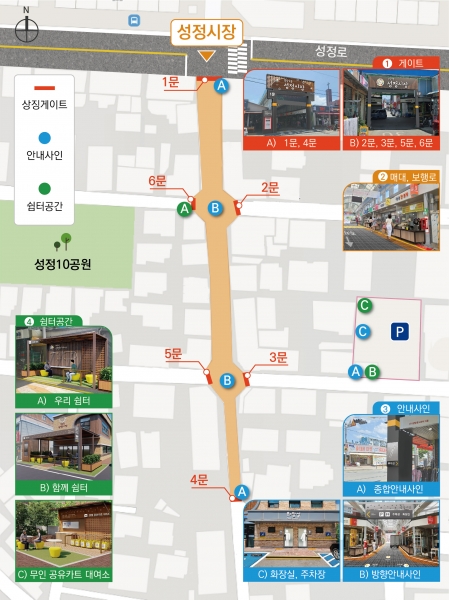 성정동 일원 게이트 디자인 개선부터 안내사인 시인성 강화, 방문객 쉼터 공간과 무인 공유카트 대여소를 조성하는 등 누구나 성정시장을 편안하게 방문하고 쉴 수 있도록 공간을 조성할 방침이다.
