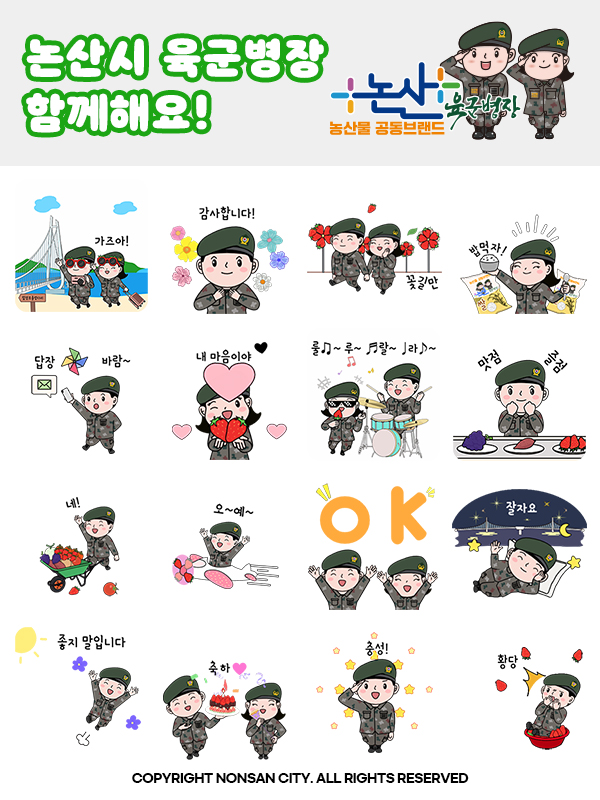 ‘듬직 깜찍’논산시 농산물 공동브랜드 육군병장이 이모티콘으로 나왔다