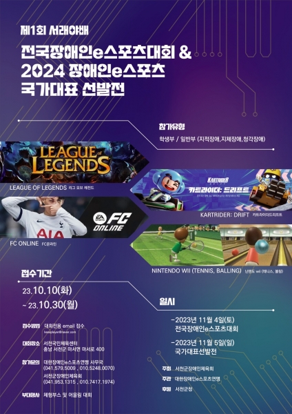 군은 오는 11월 4일부터 이틀간 서천국민체육센터에서 ‘2023년 서래야배 전국장애인e스포츠대회 및 2024 장애인e스포츠국가대표선발전’을 개최한다고 밝혔다.