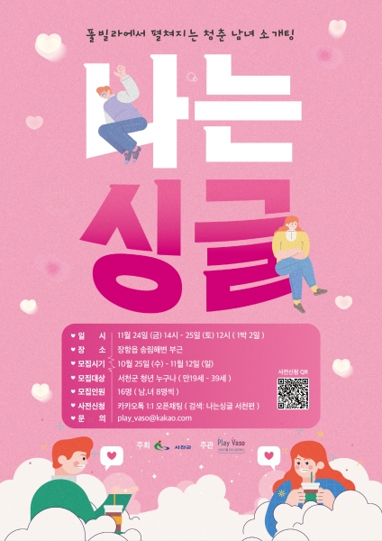 참여 방법은 카카오톡 오픈 채팅에 ‘나는싱글 서천편’을 검색하거나 큐알코드를 통해 1대1 채팅방에 입장한 뒤 참가 신청할 수 있다.
