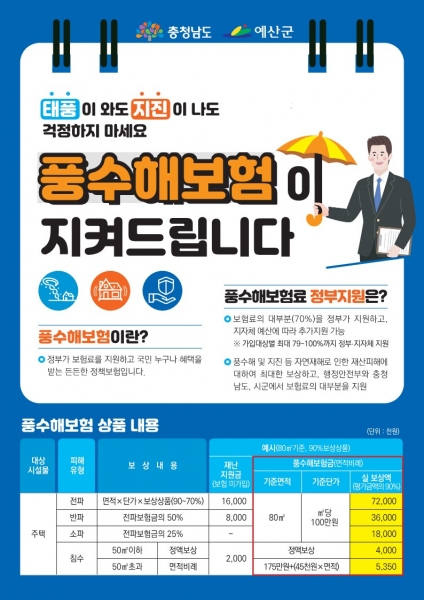 가입 방법 및 주요 내용 등 풍수해보험과 관련한 자세한 사항은 예산군 재난안전포털 안전해U에서 확인할 수 있다.