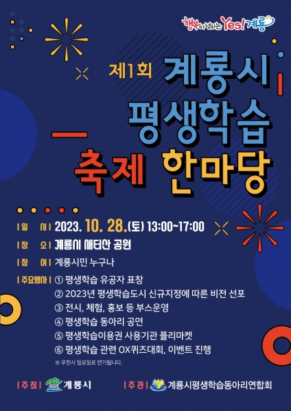 [Ytv영상스토리] 계룡시는 오는 28일 토요일 오후 1시 시청 앞 새터산 공원에서 ‘제1회 계룡시 평생학습 축제 한마당’을 개최한다고 밝혔다.