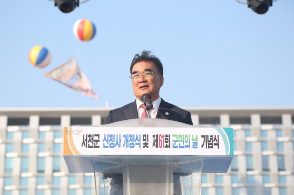 김기웅 군수는 기념사를 통해 “서천군 개청 57년 만에 신청사 이전을 하기까지 뜨거운 지원과 성원을 보내 주신 군민 여러분께 감사드린다”며 “신청사 개청식과 군민의 날 기념식이 함께 열리는 오늘은 서천군민의 염원과 미래가 함께 만들어지는 서천의 새 역사의 시작”이라고 강조했다.