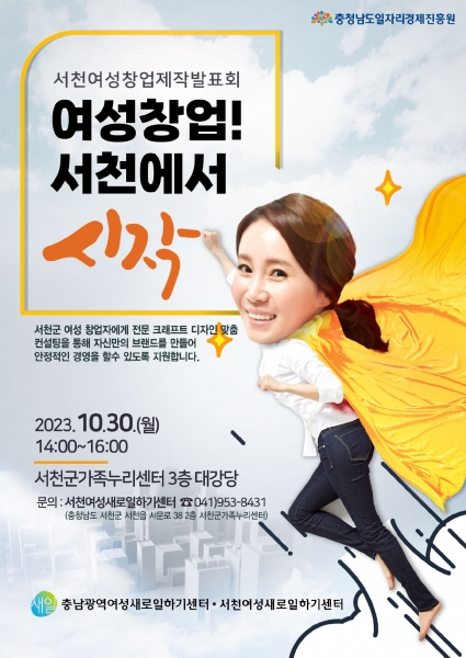 충남광역새일센터와 서천여성새일센터가 주관하는 이번 행사에는 경력단절여성 및 예비 창업자를 대상으로 창업 제작발표회 창업 토크 콘서트 제작물 전시회가 진행된다.