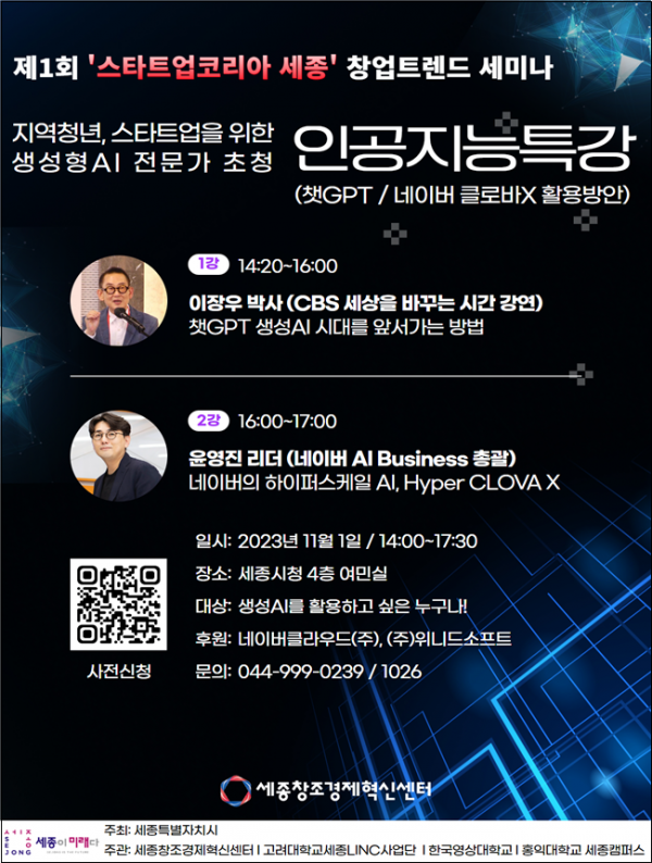 세종특별자치시와 세종창조경제혁신센터는 11월 1일 오후 2시 시청 여민실에서 ‘제1회 스타트업 코리아 세종 창업 트렌드 세미나’를 열고 생성형 AI 강연을 진행한다고 밝혔다.