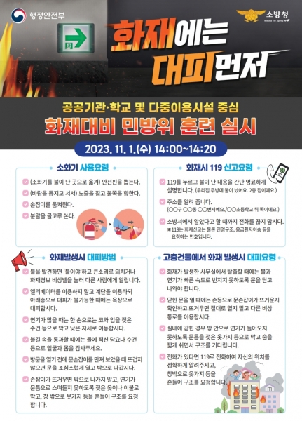 가상 화재 발생에 따른 화재 발생 신고 상황전파 및 대피 등 대응훈련으로 진행되며 유도요원의 안내에 따라 건물 밖이나 대피장소로 신속히 이동 후 화재 시 국민행동요령, 심폐소생술 등의 교육이 진행될 예정이다.