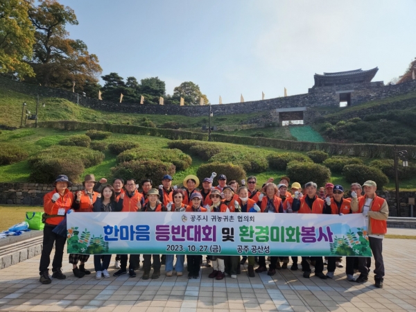27일 귀농귀촌 활성화와 단체 화합 강화, 지역사회 봉사를 위해 공산성 일원에서 한마음 등반대회 및 환경미화 봉사를 실시했다(사진=공주시)