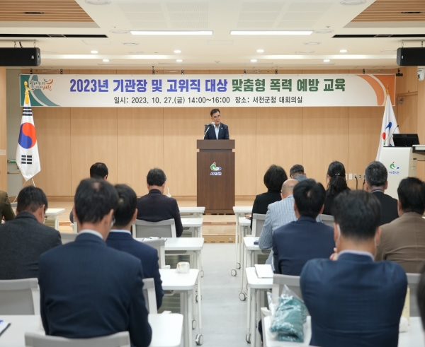 [Ytv영상스토리] 서천군이 지난 27일 군청 대회의실에서 김기웅 군수를 비롯한 5급 이상 고위직 공무원, 군의회 의원 등 55명을 대상으로 ‘고위직 대상 맞춤형 폭력 예방 교육’을 실시했다.
