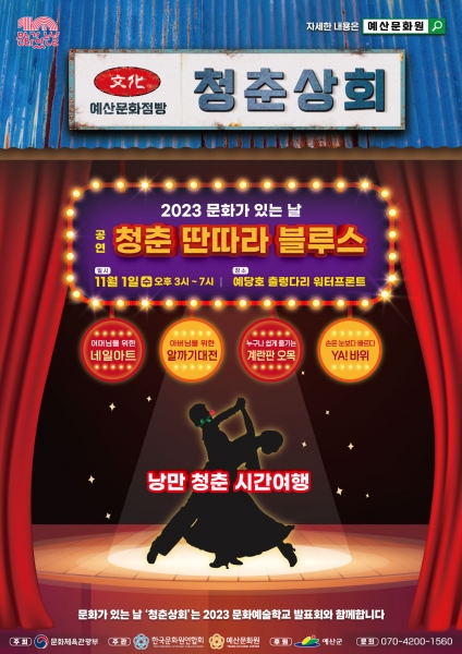 [Ytv영상스토리] 예산문화원은 오는 11월 1일 오후 3시부터 7시까지 예당호 출렁다리 수변무대에서 ‘2023 문화가 있는 날 예산문화점빵 소확행’의 두 번째 프로그램인 ‘청춘상회’를 개최한다.
